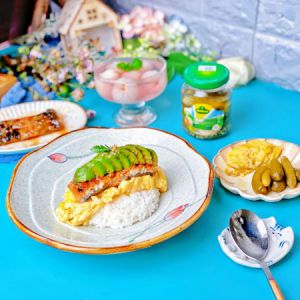 炒鸡蛋嫩滑,鳗鱼段酱香浓郁,牛油果绵软,搭配芥末籽和酸青瓜,爱了~