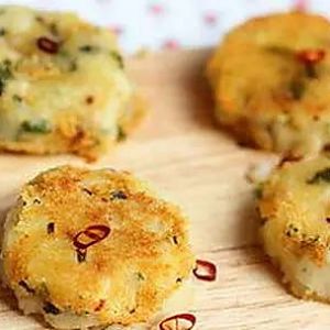 过三关:取三个物斗分别装着面粉、蛋液、面包糠。取一点土豆在面粉中裹一下,搓成圆饼状。再过一遍蛋液和面包糠。
