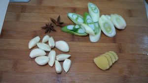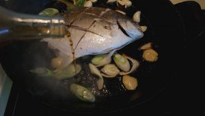 将葱姜蒜放在锅中鱼身两侧,用油煎出香味后,倒入料酒和酱油