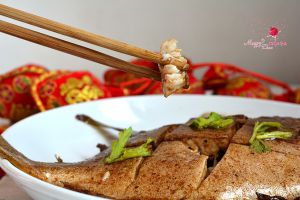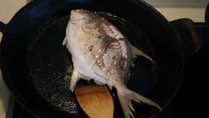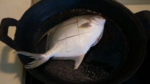 将腌鱼的料酒盐溶液倒掉,用厨房纸将鱼身内外擦干净,铸铁饼铛中多放些植物油,将鱼放入其中煎至定型,鱼身略鼓起
