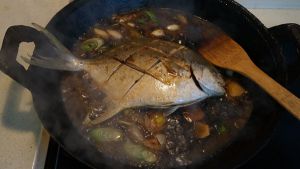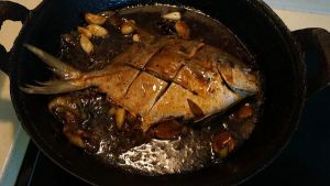 再倒入热水,水可以略多些,用铲子将汤汁浇到鱼身上