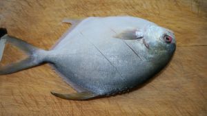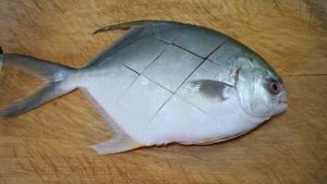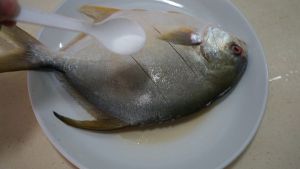 鲳鱼刮掉表面的小鳞,去掉内脏、鳃,清洗干净,用厨房纸抹去多余的水,一面切十字花刀