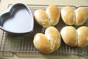 松弛完毕的4块面团,再分别平均分割成2小块,搓成水滴状、压扁、擀薄,组合成心形,放入迷你烤盘里。