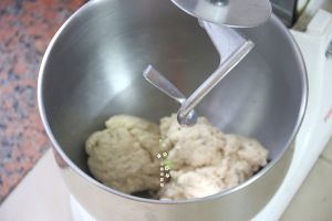 用浆形头低速(1档)把以上材料混合搅拌成团搅打几分钟后,加入切细的黄油粒继续搅打至黄油融合。