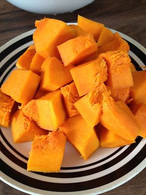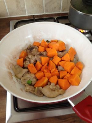 加入南瓜块,倒入泡枣的水,大火煮沸后小火炖20分钟至南瓜软即可。
