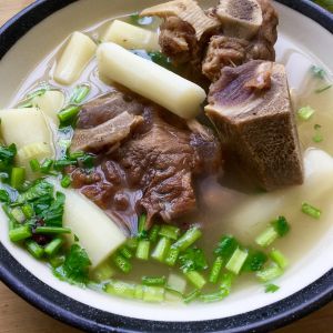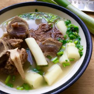 炖的差不多了的时候,把铁棍山药去皮切段后入锅再煮个十几分钟到山药软熟就行了,出锅前加适量盐,切点香菜葱花放到碗里,热汤浇上去香味满满的
