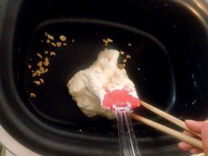 将棉花糖放进锅里,和黄油融合,融化;当棉花糖刚好融化,将奶粉倒进黄油混合物,搅拌;