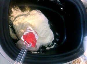 当棉花糖刚好融化,将奶粉倒进黄油混合物,搅拌;