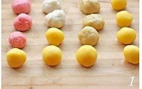 将冷却后的冰皮和奶黄馅分成均匀的8等份,俺用的是63克的月饼模,所以饼皮料要分成30克一份,奶黄馅要分成33克一份;