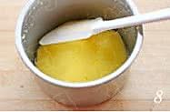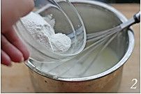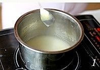 牛奶内加入糖搅拌均匀,小火加热至糖溶化,牛奶将要沸腾时离火(这一步加热很重要,俺第一次做时牛奶没有加热,牛奶是冰的,糖溶化得不充分,而且后来加入的糯米粉和澄粉也不易溶合,蒸出来的成品不顺滑),加入色拉油搅拌均匀;