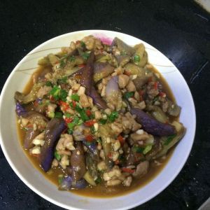 等茄子差不多快熟了,倒入炒好的肉末,大火,收汁,放入葱花和蒜末,炒匀