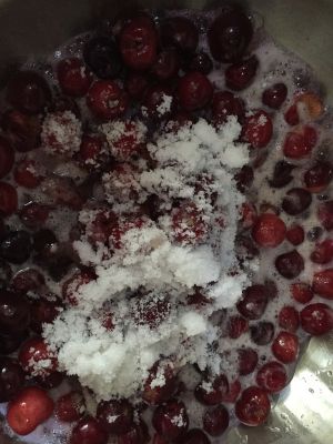 取干净无水的锅,把腌渍过的樱桃放入锅中、加入白砂糖或冰糖大火翻炒出水,小火熬制20分钟!