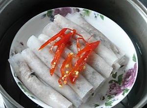 红辣椒切丝摆在已蒸熟萝卜卷上,起油锅把油浇在红辣椒上就可。