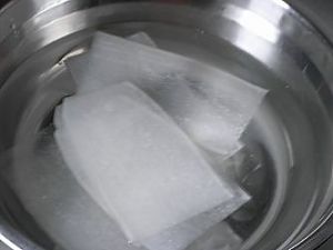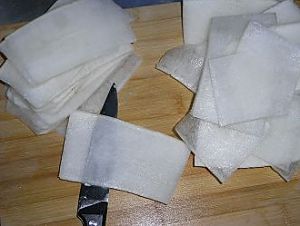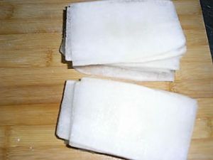 一片萝卜放入肉馅卷好,码在盆里上锅蒸十五分钟。