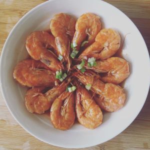 用厨房剪刀把虾背部剪开、去虾线、拿清水稍微泡一下,将葱、姜切丝,大蒜切片备用