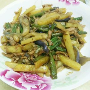 土豆炒制六七分熟 放入茄子 翻炒一两分钟吧 再放入炒好的肉丝 加盐生抽之类的和水 一起煮熟