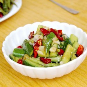 材料备好。大蒜切米,干辣椒切段。黄瓜洗净。