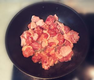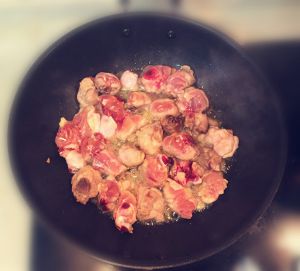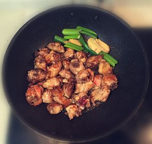 冰糖颜色出现棕黄后,加入鸡肉翻炒均匀,使鸡肉上色,加入葱姜,料酒,老抽,生抽