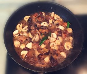 加入没过鸡肉的热水,加入蘑菇,中小火炖煮20分钟
