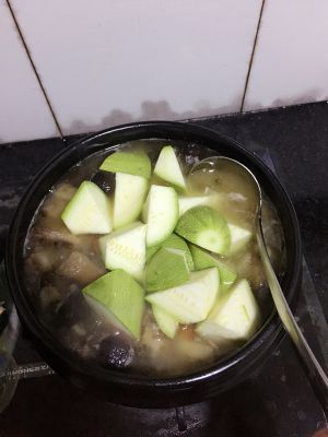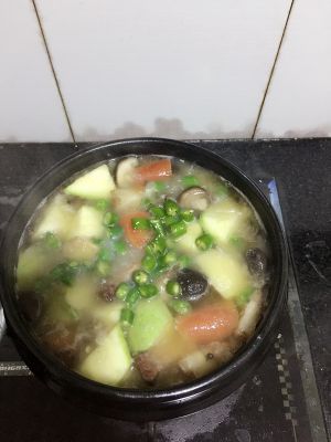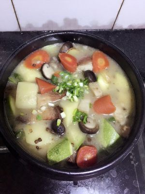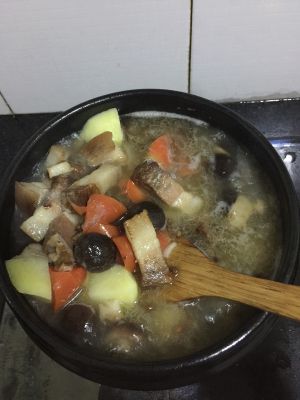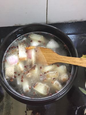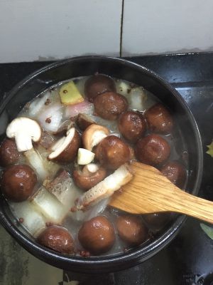 煮沸后加入香菇,开始熬煮,中小火熬大约40分钟左右。