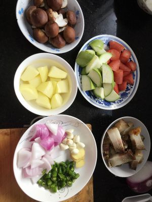 处理食材:土豆,胡萝卜,西葫芦,洋葱切块,腊肉切丁,香菇洗净,辣椒切小段。