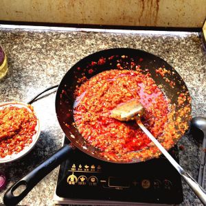 把干辣椒用水煮一下时间15分钟左右把辣椒拿出用机器绞碎了。