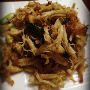 油锅烧热,加入鸡丝炸至金黄,盛起备用