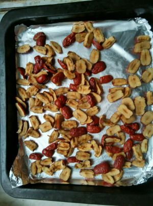 2.烤盘中铺上锡纸或油纸,把分割好的枣均匀的地放上去。烤箱120℃,烤30分钟。