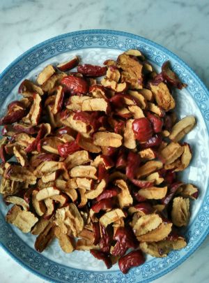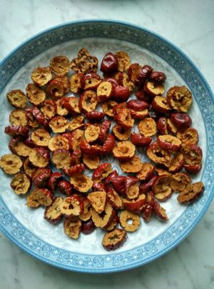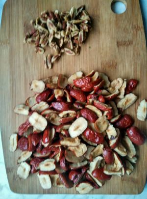 1.洗净红枣,空一下水分,用刀切成块或剪刀把枣剪成片。