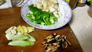 把配料都准备好,土豆,香菇切好,青椒掰一下
