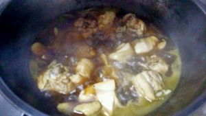 锅里放油,放一勺糖,等到冒泡泡的时候把鸡肉倒进去,翻炒一下,倒上水,沒过鸡肉(水多鸡肉就更烂一点),把剩下的葱姜和蒜,花椒放进去,倒酱油,盖上锅盖煮一下