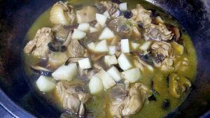 开锅以后放入土豆,蘑菇,再盖上盖咕嘟一下