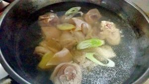 鸡肉切块,洗干净,切好的葱姜拿几片,留几片,加料酒冷水下锅,煮一下