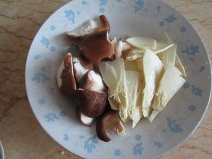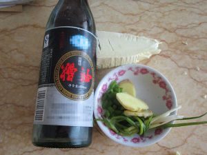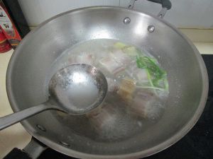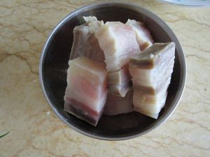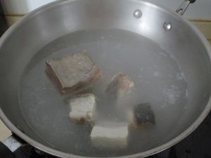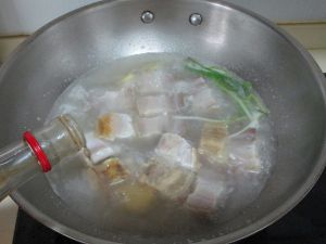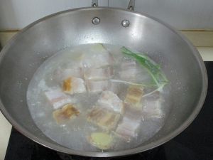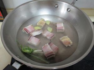 另起锅下入咸肉块,把生姜片和小葱结加入