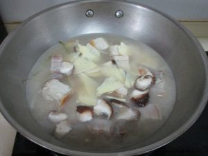 先把咸肉冷水下锅煮开后再煮15分钟后打开加入鱼块煮开后捞起
