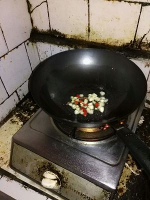 准备好其他食材。青椒切条,干红椒洗干净,蒜子,生姜粒准备好。