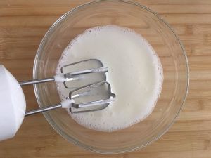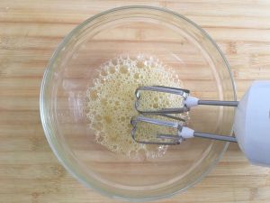 4.接下来把蛋白和盐打发,糖分三次加入,打发到粗泡加人1/3糖