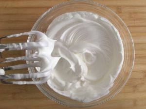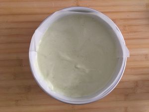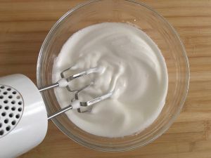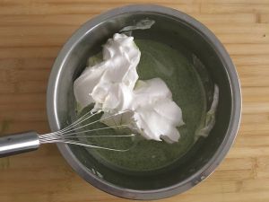 8.蛋白分两次倒入蛋黄糊中,拌匀。