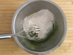 2.筛入低筋粉、抹茶粉,继续拌匀,不要过度搅拌。