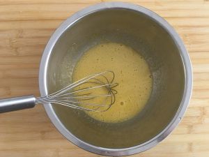 1.蛋黄加糖打发到白,加入溶化成液体的黄油拌匀。