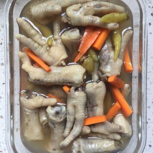 泡椒连汁倒入后,再加适量料酒、盐和生抽,就成功了。盖上盖子,放入冰箱,静置两小时以上,麻辣味十足的泡椒凤爪就做好啦!^_^