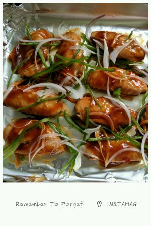 把鸡翅洗干净,在鸡翅上划几刀,把少许盐抹在鸡翅上,腌制10分钟;随后把亨氏烧烤酱、泰国甜辣酱抹在鸡翅上腌制1小时左右。在烤盘上铺上铝箔纸,铺上洋葱丝,把鸡翅放在洋葱上,在撒上洋葱丝和青椒丝。