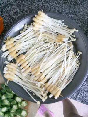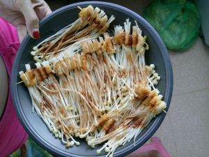 无聊时候用牙签把金针菇和豆腐都串在了一起,摆好盘