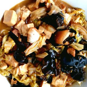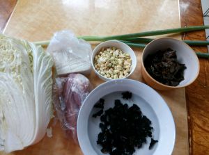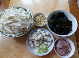 白菜切好,蘑菇洗好,木耳泡发,豆腐切好,肉切片,豆嘴洗干净