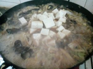 先炒肉,放葱,然后放白菜,白菜炒的塌下去,再把豆嘴蘑菇木耳放进去,翻炒一会,然后倒进去水,多放水,调料要放进去,开一会,就把粉条洗洗剪一下放进去,粉条要放上边,不能翻动,不然会抓锅,然后在粉条上边放上豆腐,盖盖儿,等着就好了