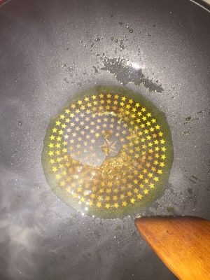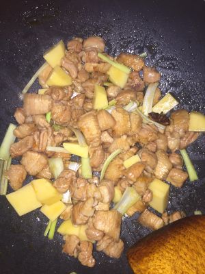 倒入五花肉,土豆,大葱丝,和八角,翻炒上色