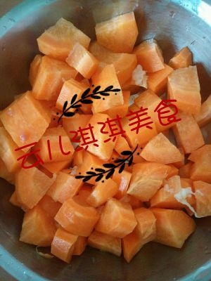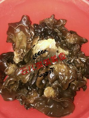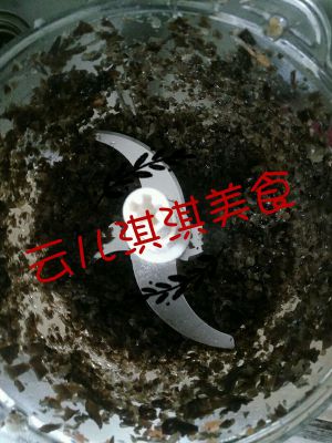 将胡萝卜,木耳放到绞肉机打成小丁,然后加到搅拌好的肉泥里,还是往同一方向搅拌均匀