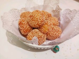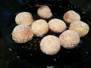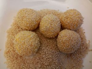 裹上芝麻(最好全部裹好再炸,这样炸的时候不至于太慌乱)
