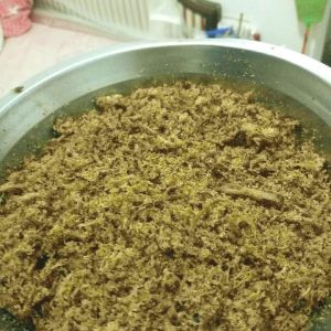 之后放入料理机打碎。再放入锅中翻炒,一定小火。不放油。