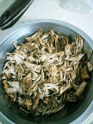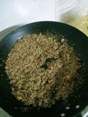 大火收汁后,把肉捡出来撕丝。如锅中小火翻炒。切勿火大,会胡。